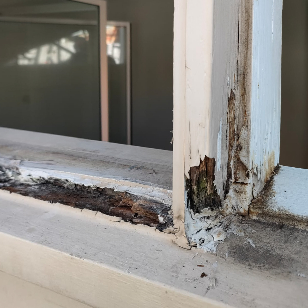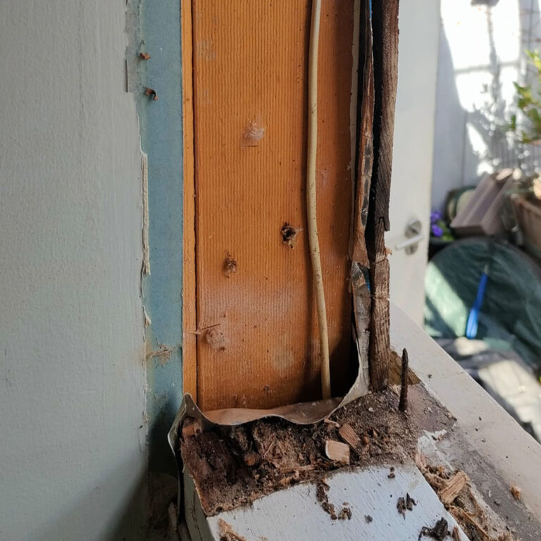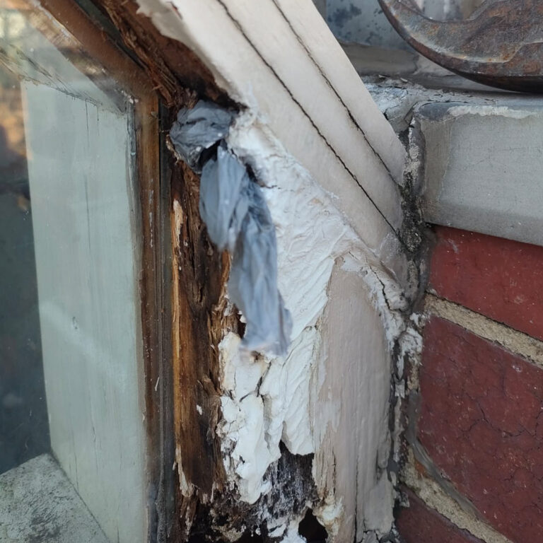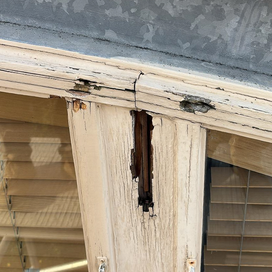 The owner of this unique outbuilding called because of water leaks in the ground-floor bathroom and on the first-floor windows. During our inspection, we identified decayed window frames and cracks in the roof gutter as the primary source of the problem. The structural damage to the front façade was significant, and many structural elements, as well as the first-floor window frames, were beyond repair. The outbuilding had become structurally unsound and hazardous. As a result, most of the façade elements had to be replaced.