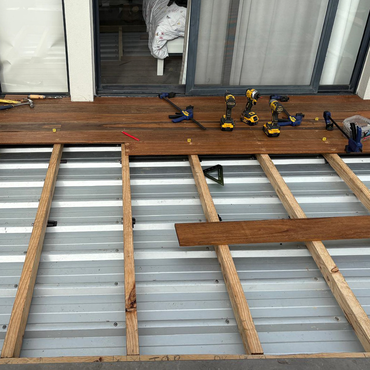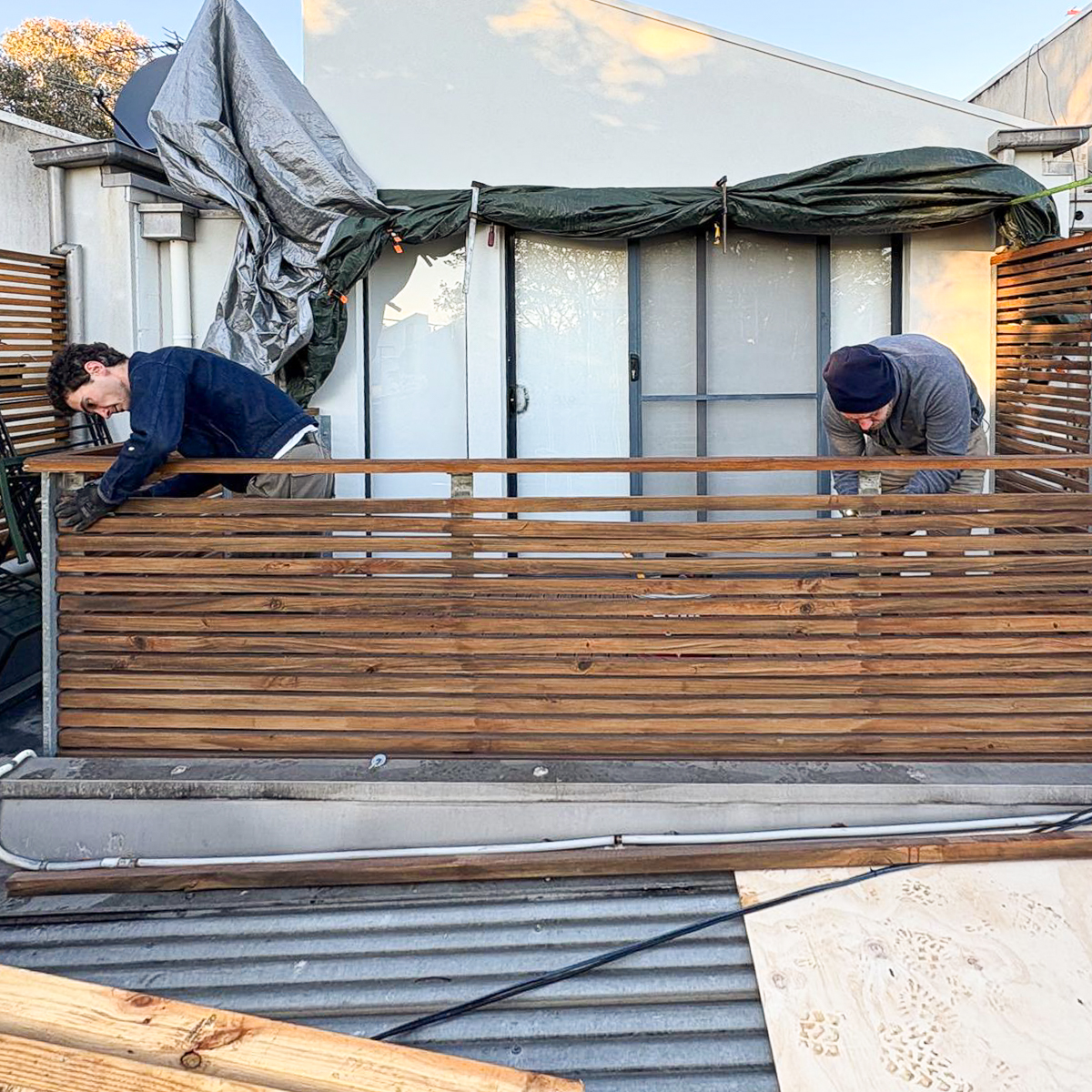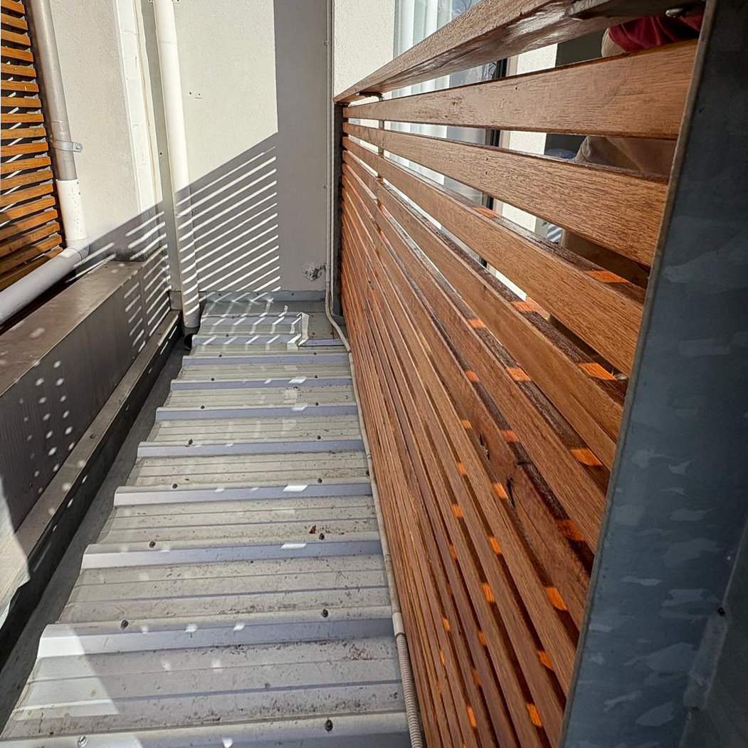 Our customer now enjoys a structurally sound, completely waterproof balcony with beautifully oiled timber floorboards, balustrade, and screen.